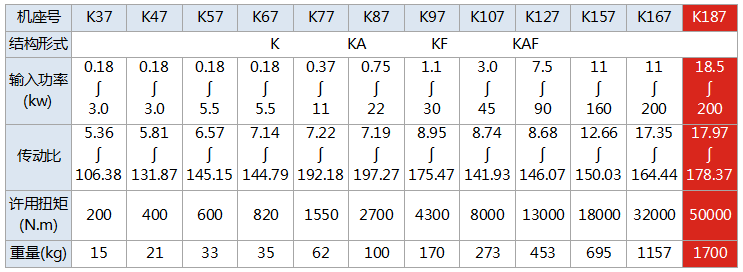 K系列減速機,結合國際技術要求制造,具有很高的科技含量,節省空間,可靠耐用, 承受過載能力高,功率可達200Kw,能耗低,性能優越,減速機效率高達95%以上,振動小,噪音低,節能高,選用優質鍛鋼材料,鋼性躊鐵箱體,齒輪表面 經過滲碳淬火,經過精密加工,構成了斜齒輪、傘齒輪,錐齒輪傳動總成的減速機。