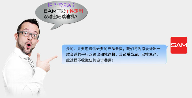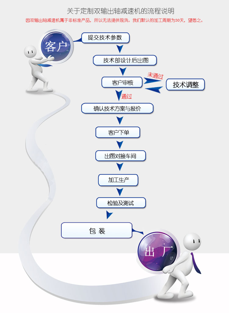 雙輸出軸減速機僅僅是非標準減速機中較有代表性的產品之一,在十多年的產品定制過程中,我們接觸了太多的非標減速機案例,比如6軸、8軸、甚至還有14軸的多軸減速機。其實,我們關心的不是您的設備需要幾根輸出軸,我們關心的是,您的技術參數是否準確并完整。只要技術參數到位了,正常情況下,我們都可以給出佳的技術方案。