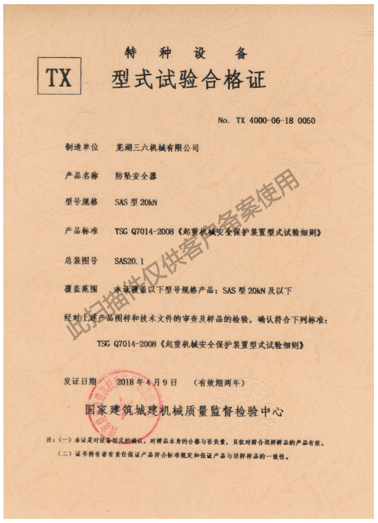 防墜器作為起重機械的安全裝置,需經過國家建筑城建機械質量監督檢驗中心檢驗,并且每兩年需要復審一次。擁有《特種設備型式試驗合格證》才能被允許生產制造及銷售。
